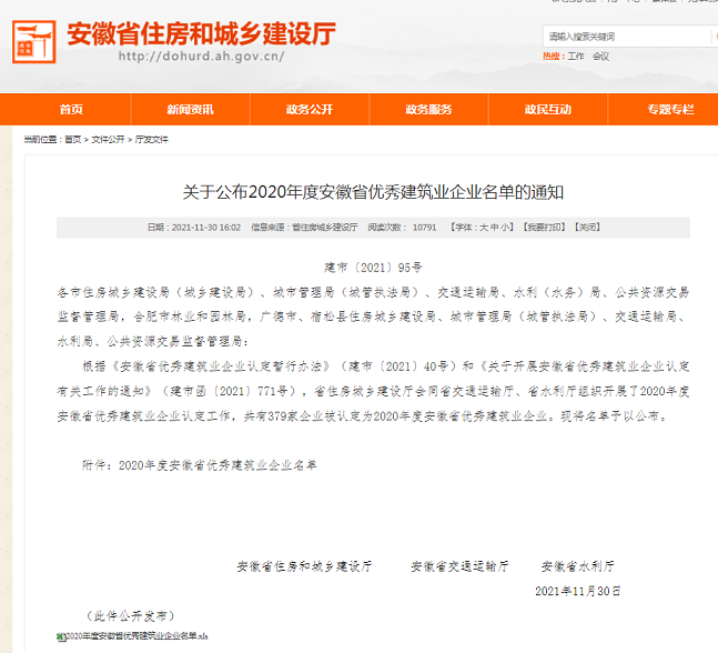 據(jù)悉,本次評優(yōu)是由安徽省住房和城鄉(xiāng)建設廳、省交通運輸廳、省水利廳首次聯(lián)合開展的全省優(yōu)秀建筑業(yè)企業(yè)認定評選活動,安徽省優(yōu)秀建筑業(yè)企業(yè)稱號是對我省建筑業(yè)企業(yè)綜合實力的認定。