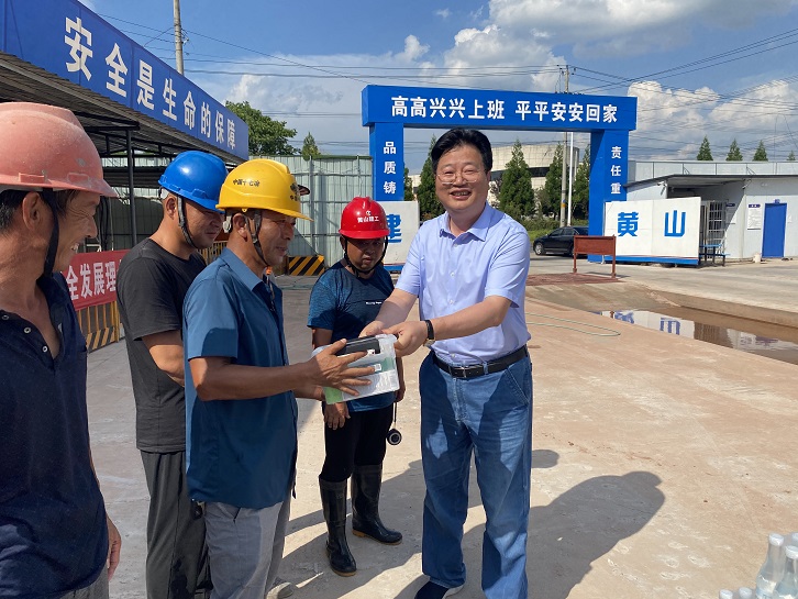 7月21上午,業(yè)主單位黃山市城投集團(tuán)黨委書記、董事長陳杰、總裁黃世穩(wěn)等一行分組帶隊(duì)到我公司承建的黃山市危險(xiǎn)(含醫(yī)療)廢物集中處置中心易地重建工程、黃山市南部城鎮(zhèn)群水務(wù)調(diào)度中心項(xiàng)目、黃山生豬定點(diǎn)屠宰加工及配套設(shè)施項(xiàng)目及配套冷鏈項(xiàng)目施工現(xiàn)場送來了人丹、十滴水、礦泉水、西瓜等防暑降溫用品,并向奮戰(zhàn)在一線的施工人員及項(xiàng)目部管理人員表示了親切的慰問和感謝,對(duì)一線人員頭頂烈日不畏酷暑的精神給予了贊揚(yáng)。