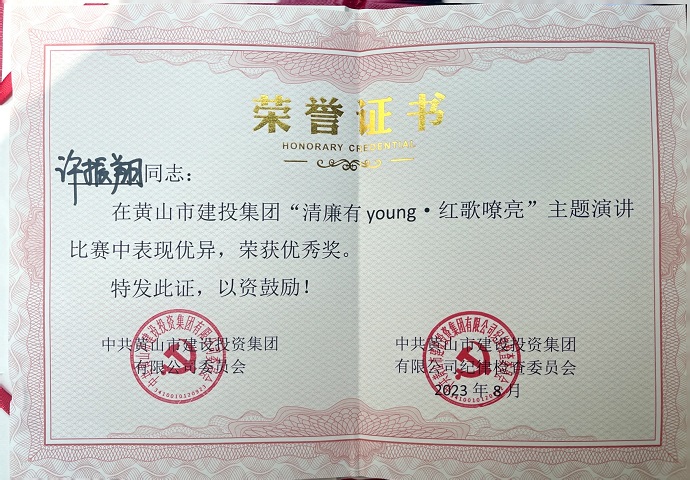 為慶祝中國(guó)共產(chǎn)黨成立102周年,深入推動(dòng)學(xué)習(xí)貫徹習(xí)近平新時(shí)代中國(guó)特色社會(huì)主義思想主題教育,全面貫徹落實(shí)黨的二十大精神,8月18日,由黃山建投集團(tuán)舉辦的“清廉有young·紅歌嘹亮”主題思政課隆重舉行,參賽選手以生動(dòng)的語(yǔ)言、動(dòng)聽(tīng)的歌聲、真摯的感情為大家?guī)?lái)一場(chǎng)別開(kāi)生面的視聽(tīng)盛宴,黃山建工集團(tuán)青年員工許振翔在思政課演講比賽中取得優(yōu)勝獎(jiǎng)。