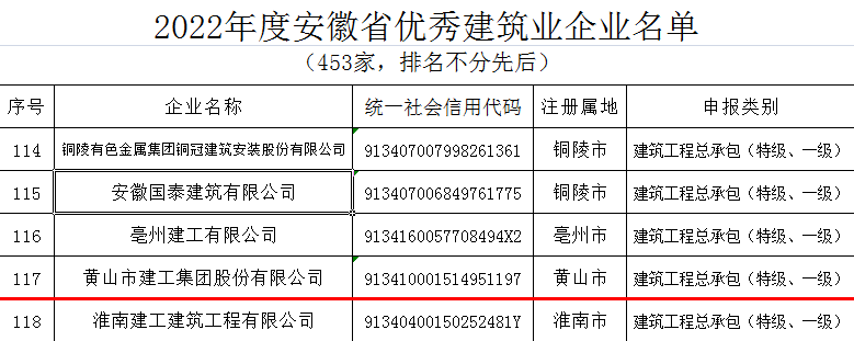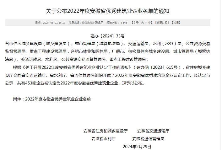近日,安徽省住房和城鄉(xiāng)建設(shè)廳發(fā)布了“2022年度安徽省優(yōu)秀建筑業(yè)企業(yè)”名單,黃山建工集團(tuán)憑借企業(yè)經(jīng)營(yíng)發(fā)展、管理創(chuàng)新能力、企業(yè)建造能力、企業(yè)文化建設(shè)、社會(huì)責(zé)任履行等方面的卓越表現(xiàn)再次名列榜單――建筑工程總承包類(lèi)(特級(jí)、一級(jí)類(lèi)別)省優(yōu)秀建筑業(yè)企業(yè),連續(xù)多年斬獲該項(xiàng)殊榮。