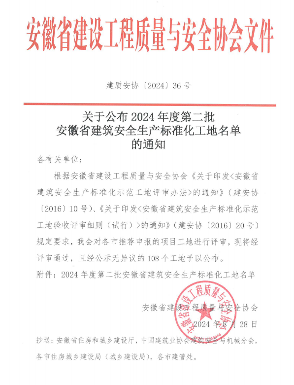 近日,安徽省建設(shè)工程質(zhì)量與安全協(xié)會(huì)公布2024年度第二批安徽省建筑安全生產(chǎn)標(biāo)準(zhǔn)化工地名單,由黃山建工集團(tuán)承建的國(guó)網(wǎng)安徽黃山供電公司運(yùn)維檢修及信息通信用房項(xiàng)目光榮上榜。